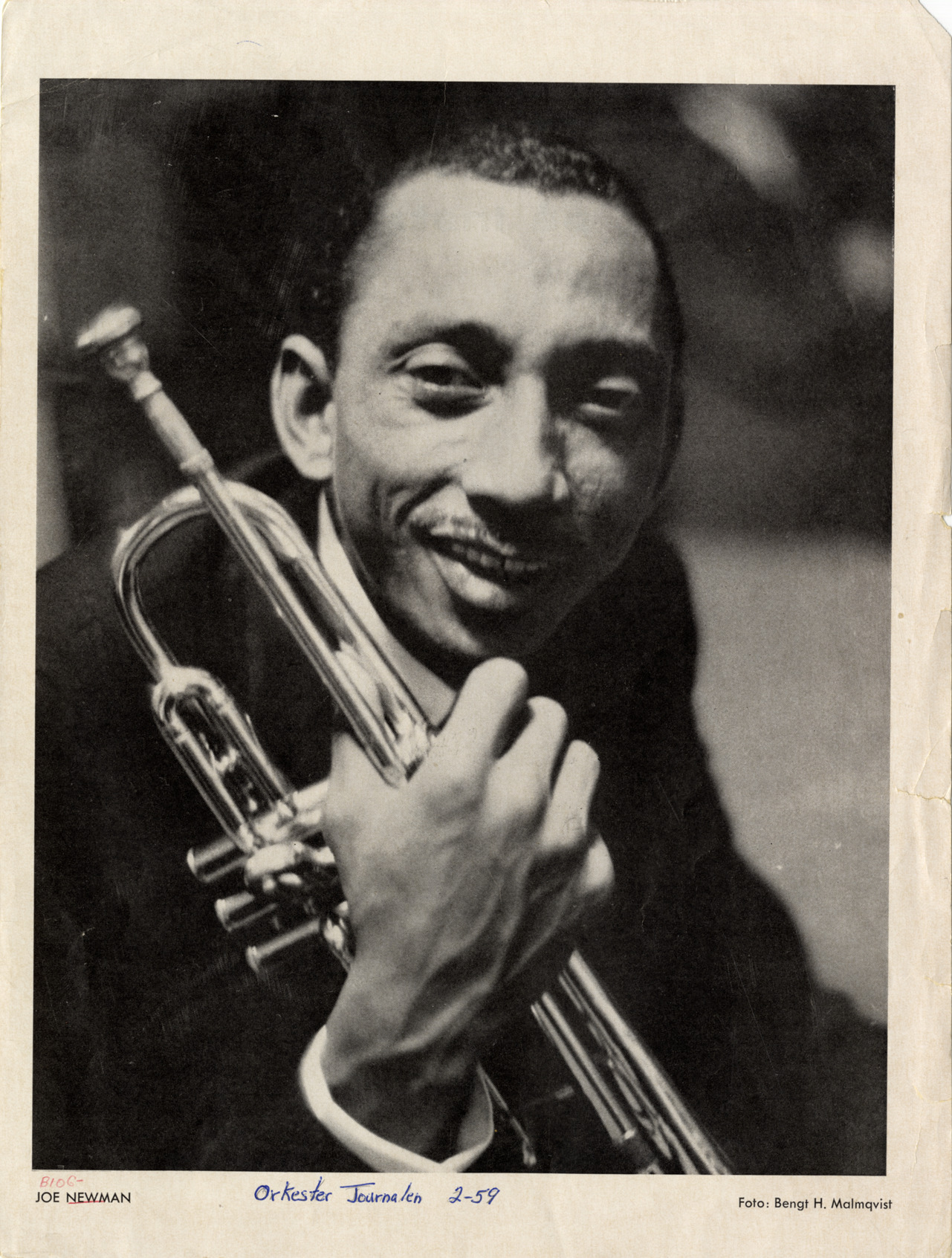 Favorite this☆ Joe Newman Description: Portrait of musician Joe Newman, holding a trumpet. Printed on front: "Joe Newman. Foto: Bengt H. Malmqvist." Handwritten on front: "Orkester Journalen, 2-59." Details Resource ID: hk001376 Creator: Malmqvist, Bengt H. Subject: Newman, Joe African American musicians Trumpet players Trumpet Clippings (Books, newspapers, etc.) Note (Source): Orkester Journalen Date Issued: 1959-02 Format: 1 clipping ; 11.5 x 8.5 in. Member of: E. Azalia Hackley Collection Filing Location: Biography--Newman, Joe Rights: Physical rights are retained by DPL. Copyright is retained in accordance with U.S. copyright laws.