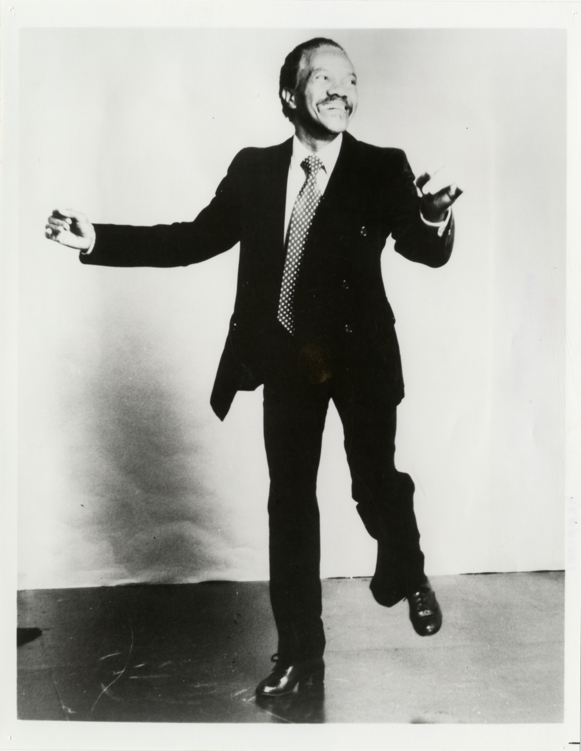 Portrait of tap dancer Harold Nicholas. Label on back: "The Tap Dance Kid. Harold Nicholas as 'Daddy Bates' in the Tony Award winning musical, 'The Tap Dance Kid.' Fisher Theater, December 18 thru January 12. Contact: National Press Representatives Smyth Katzen Incorporated, 6300 Westpark, Suite 210, Houston, Texas 77057. 713-782-7883."