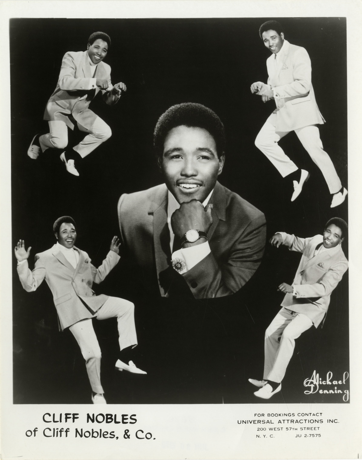 Five views of singer Cliff Nobles of the musical group Cliff Nobles & Co. Printed on front: "Cliff Nobles of Cliff Nobles, & Co. For bookings contact Universal Attractions Inc., 200 West 57th Street, N.Y.C., JU 2-7575. Michael Denning." Handwritten on back: "Cliff Nobles."