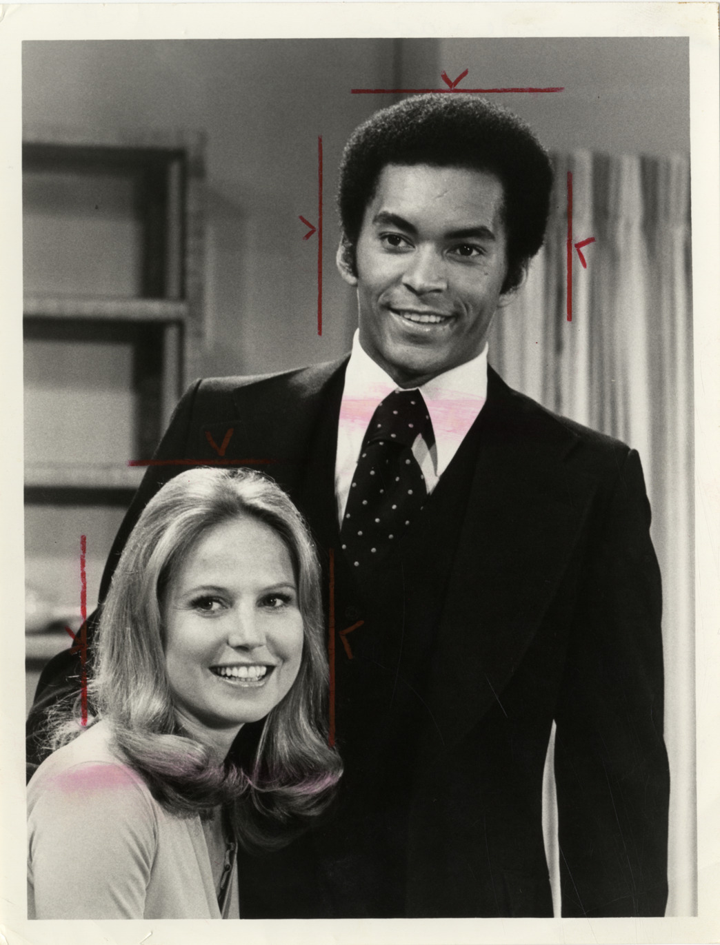 View of actor Bill Overton and actress Leslie Charleson in "Guess who's coming to dinner." Label on back: "Leslie Charleson and Bill Overton star as newlyweds John and Joanna Prentiss in "Guess who's coming to dinner," a half-hour comedy special based on the motion picture that starred Spencer Tracy and Katharine Hepburn, which will air on the ABC Television Network, Wednesday, May 28 (9:30-10:00 p.m., EDT)." Handwritten on back: "Overton, Bill, actor. Title: 'Guess who's coming to dinner.'"