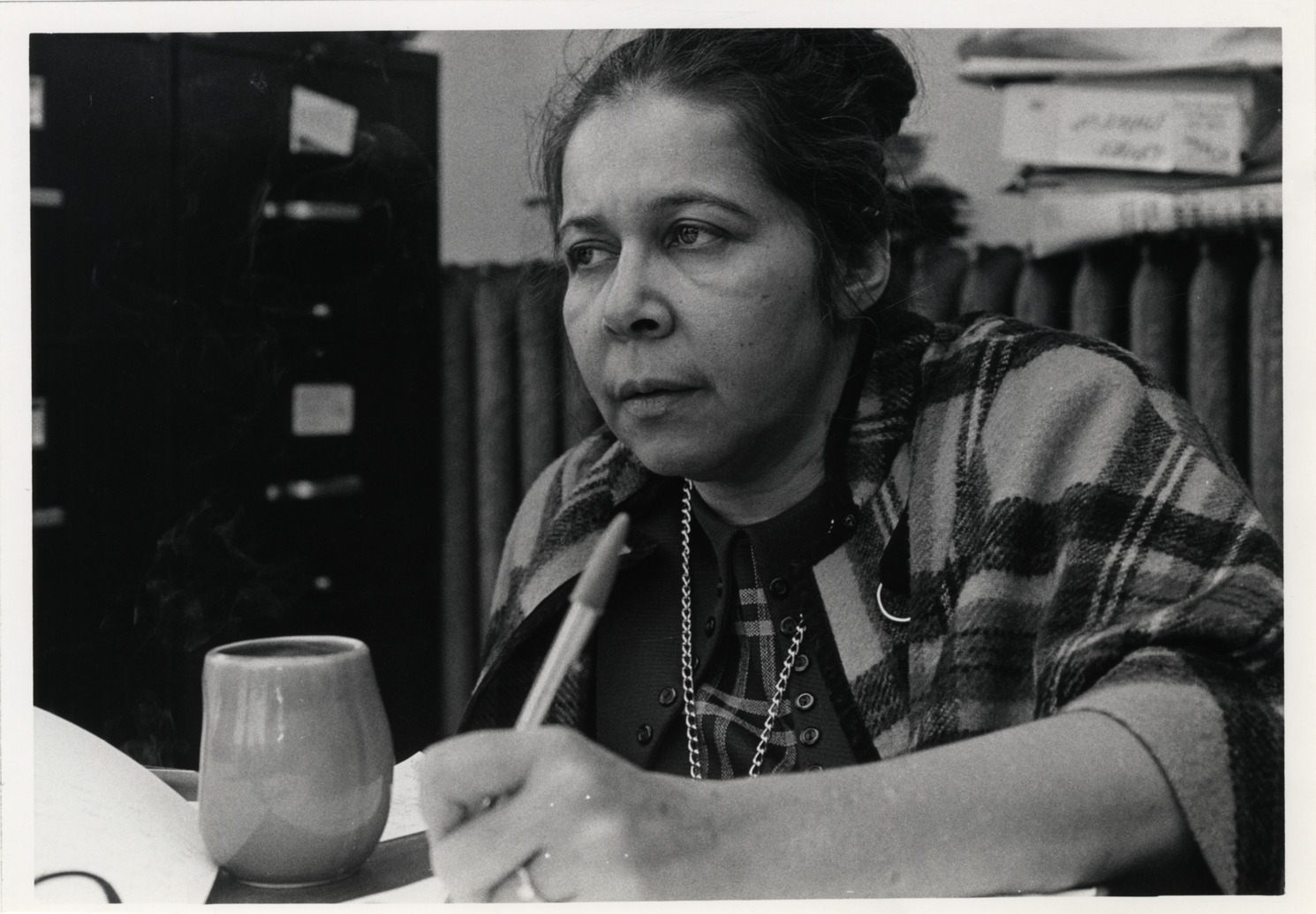 Portrait of actress and director Alma Parks. Label on back: "Mrs. Alma Parks, Drama Component Co-Director of Metro Arts, has worked professionally in radio, television and on Broadway. She has conducted numerous drama clinics and has developed a new 'drama counseling technique' to help people in distress." Handwritten on back: "Parks, Alma, actress."