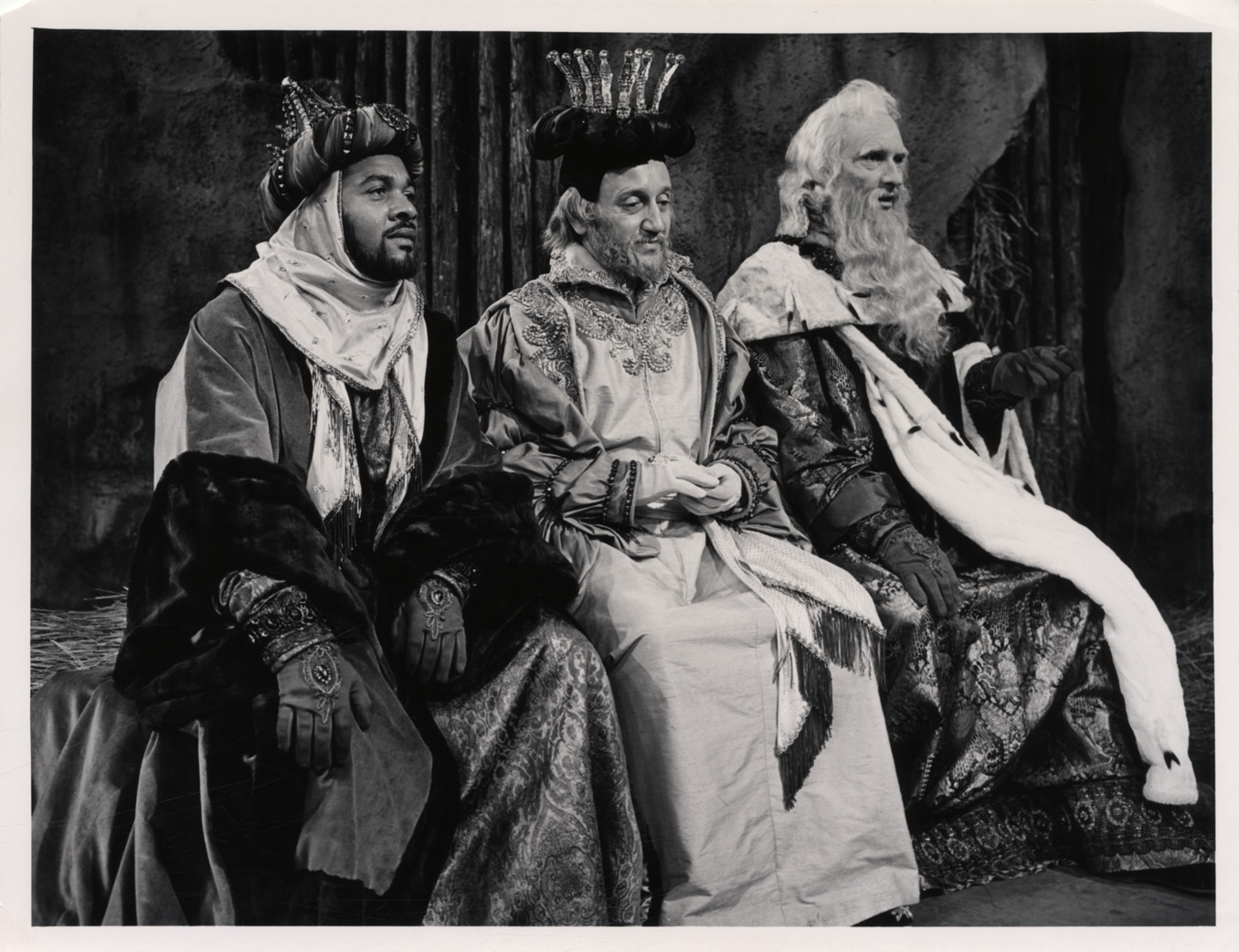 View of Willis Patterson, John McCollum and Richard Cross in Menotti's opera, "Amahl and the night visitors." Typed on back: "Willis Patterson, John McCollum and Richard Cross in 'Amahl and the night visitors' (new television production, NBC Opera, 1963)."