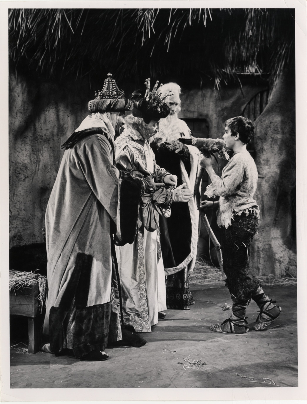 View of Willis Patterson, John McCollum, Richard Cross and Kurt Yaghjian in Menotti's opera, "Amahl and the night visitors." Label on back: "NBC color television. Exclusive to you in your city. 'Amahl and the night visitors.' Kurt Yaghjian, 12 year-old boy soprano, will portray Amahl in the all-new production of Gian Carlo Menotti's opera 'Amahl and the night visitors,' taped by the NBC Opera Company for telecast in color on Christmas night, Wednesday, Dec. 25. With him here are Willis Patterson, as King Balthazar; John McCollum, as King Caspar; and Richard Cross, as King Melchior. (12/3/63)."
