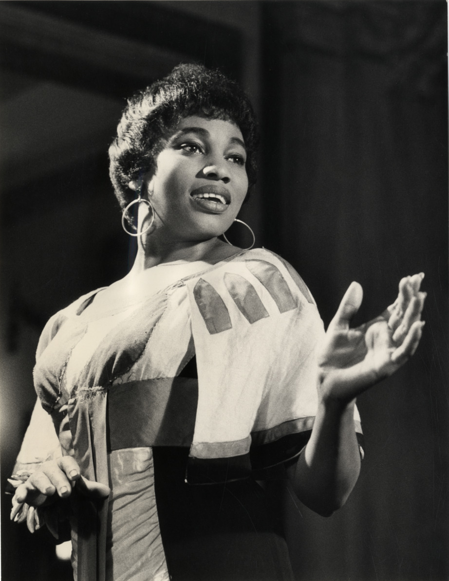 Portrait of soprano Leontyne Price in Verdi's opera, "Aida." Stamped on back: "Copyright photograph by Dominic. Dominic, 31, Chelsea Square, S.W.3., tel. Flaxman 6118." Label on back: "As Aida in her English debut role at the Royal Oper House, Covent Garden, July, 1958." Handwritten on back: "Leontyne Price."