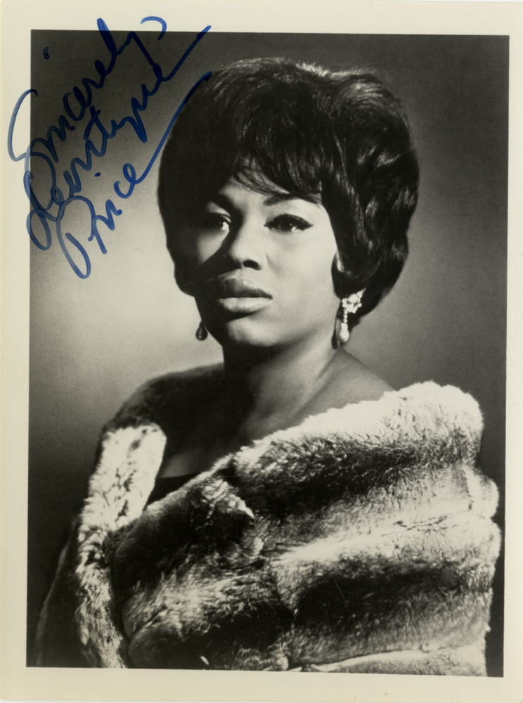 Portrait of soprano Leontyne Price. Autographed on front: "Sincerely, Leontyne Price."