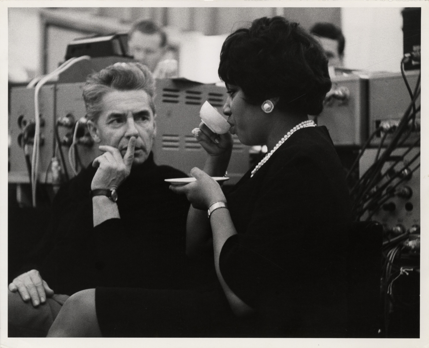 View of soprano Leontyne Price and conductor Herbert von Karajan listening to recording playback. Price sips a cup of tea. Stamped on back: "Please credit RCA Records." Handwritten on back: "Herbert von Karajan, with Leontyne Price, listening to a playback at recording session of opera, 'Carmen.'"