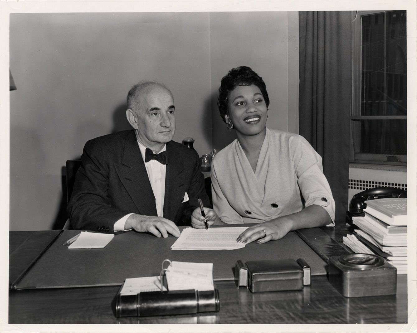 Favorite this☆ Leontyne Price and Samuel Chotzinoff Description: View of soprano Leontyne Price signing document with producer Samuel Chotzinoff. Handwritten on back: "Producer, Samuel Chotzinoff, Miss Price." Details Resource ID: hk001495 Subject: Price, Leontyne African American women singers Chotzinoff, Samuel, 1889-1964 Photographic prints Date Issued: Unknown year Format: 1 photographic print ; 7.25 x 9 in. Member of: E. Azalia Hackley Collection Filing Location: Biography--Price, Leontyne Rights: Physical rights are retained by DPL. Copyright is retained in accordance with U.S. copyright laws.