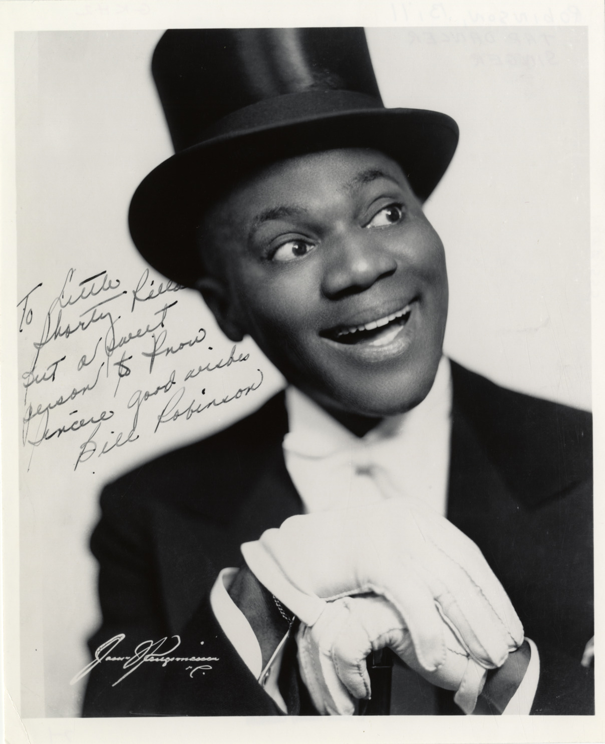 Portrait of dancer Bill "Bojangles" Robinson. Autographed on front: "To Little Shorty [undecipherable], but a sweet person to know. Sincere good wishes, Bill Robinson." Printed on front: "James J. Kriegsmann, N.Y." Handwritten on back: "Robinson, Bill. Tap dancer, singer."