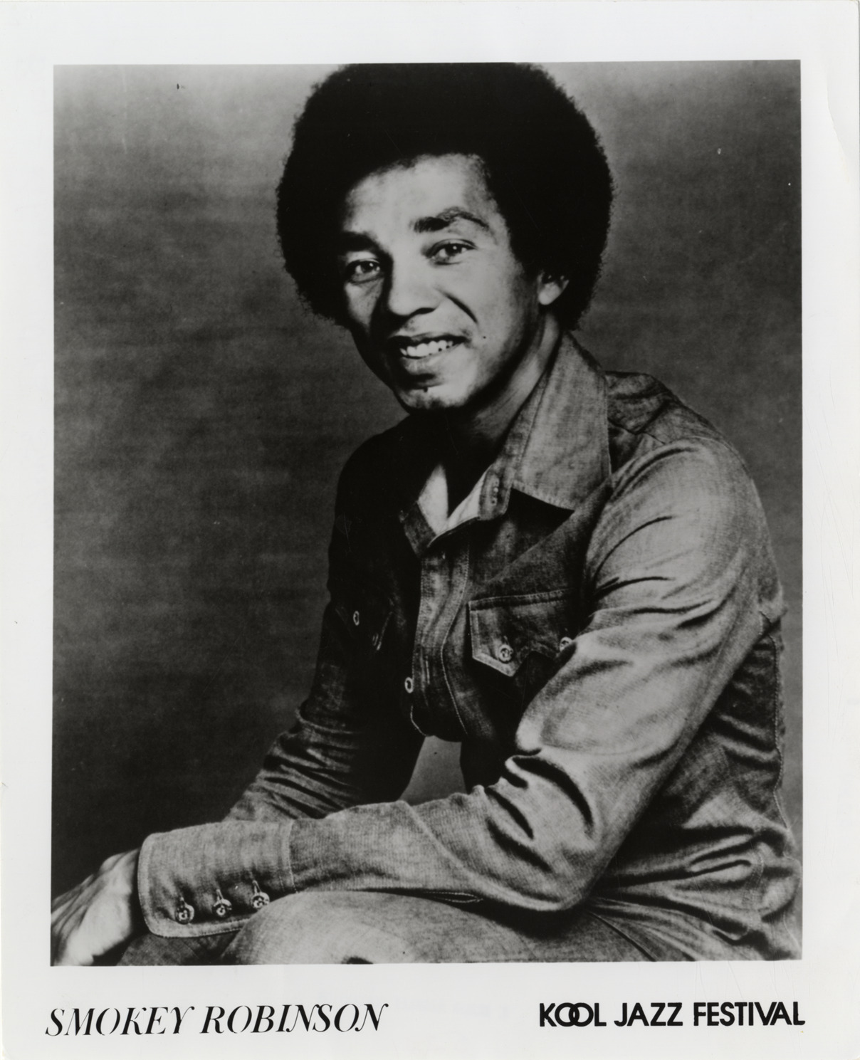 Favorite this☆ Smokey Robinson Description: Portrait of singer Smokey Robinson. Printed on front: "Smokey Robinson. Kool Jazz Festival." Details Resource ID: hk001570 Subject: Robinson, Smokey, 1940- African American singers Photographic prints Date Issued: Unknown year Format: 1 photographic print ; 10 x 8 in. Member of: E. Azalia Hackley Collection Filing Location: Biography--Robinson, Smokey Rights: Physical rights are retained by DPL. Copyright is retained in accordance with U.S. copyright laws.