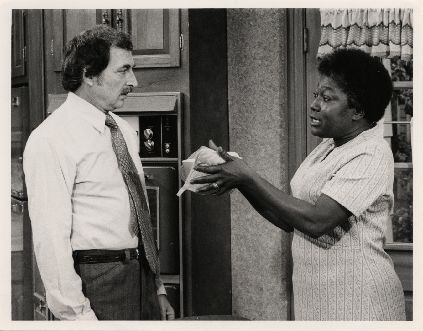 View of actress Esther Rolle and actor Bill Macy in a scene from the television series, "Maude." Label on back: "CBS, Bill Macy, starring as Walter Findlay, is not overjoyed about getting dinner from Esther Rolle, as housekeeper Florida Evans, when Maude's part-time job selling real estate keeps her out a night, on 'Maude,' Tuesday, Oct. 23 (8:00-8:30 PM, EDT) on the CBS Television Network. Photo Division, CBS Television Network press information, 51 West 52 Street, New York, New York 10019."
