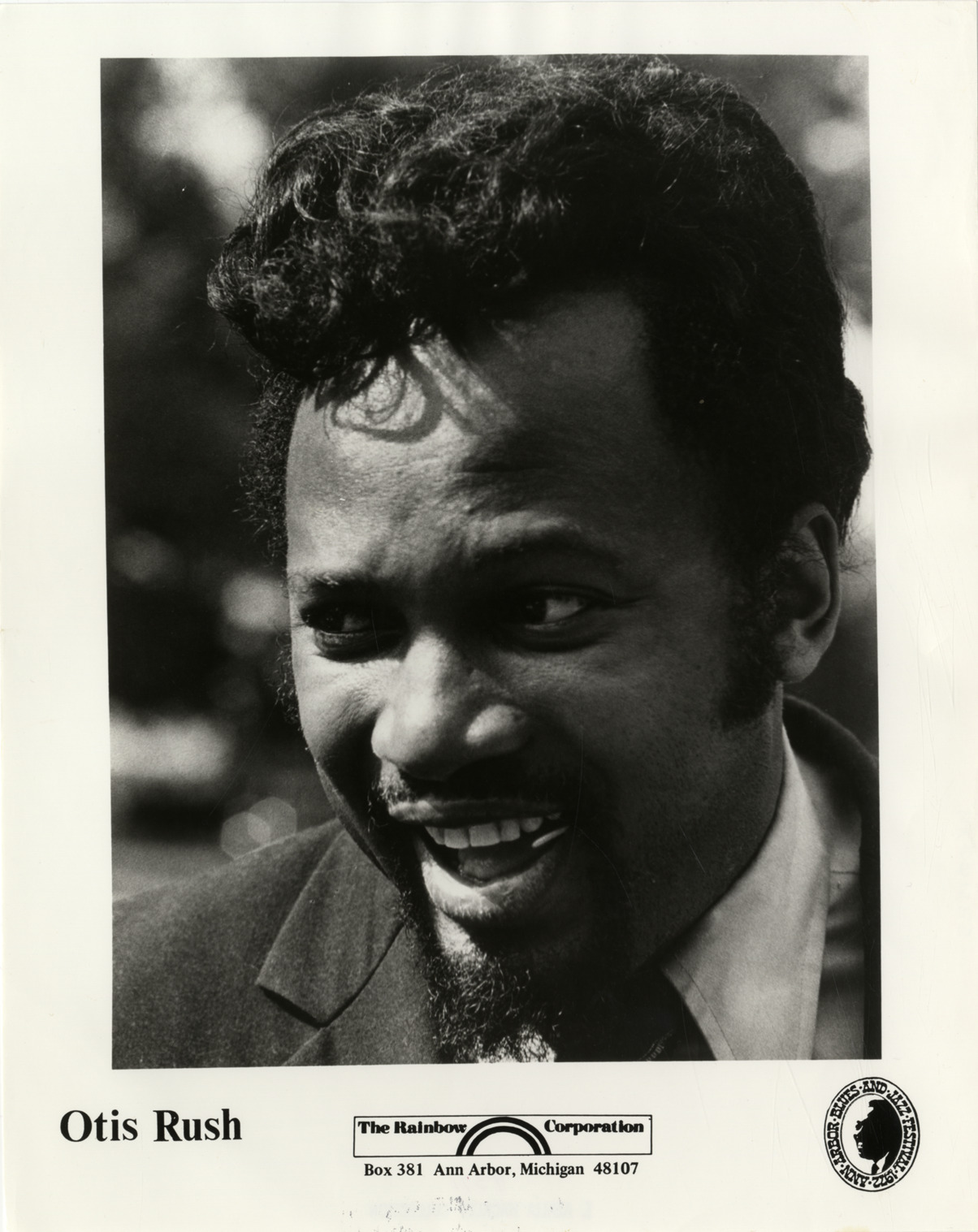 Portrait of blues musician and guitarist Otis Rush. Printed on front: "Otis Rush. The Rainbow Corporation, Box 381, Ann Arbor, Michigan 48107. 1972 Ann Arbor Blues and Jazz Festival."
