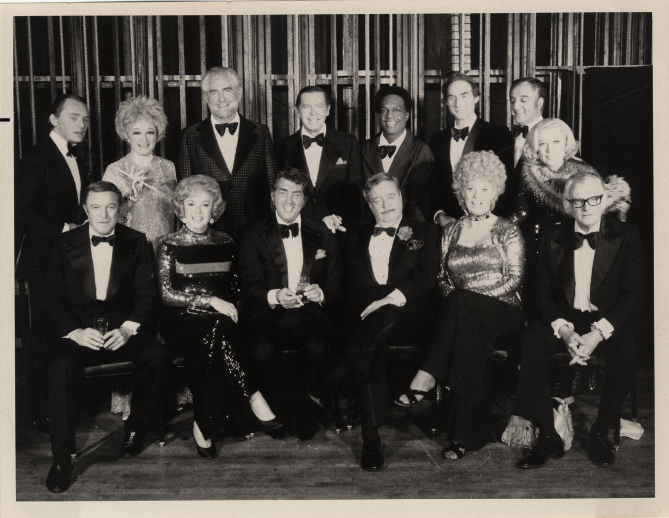 Group portrait of guests at Dean Martin's celebrity roast honoring actor Jackie Gleason. Label on back: "For the great one. On hand to honor Jackie Gleason as roastee on NBC-TV's 'Dean Martin celebrity roast,' Thursday, Feb. 27 (10-11 p.m. PT) in color are seated from left to right Gene Kelly, Audrey Meadows, host Dean Martin, Gleason, Sheila MacRae, Art Carney. Standing, left to right, Frank Gorshin, Phyllis Diller, Foster Brooks, Milton Berle, Nipsey Russell, Sid Caesar, Danny Thomas and Jane Kean." Handwritten on back: "Russell, Nipsey. 'Dean Martin celebrity roast.'"