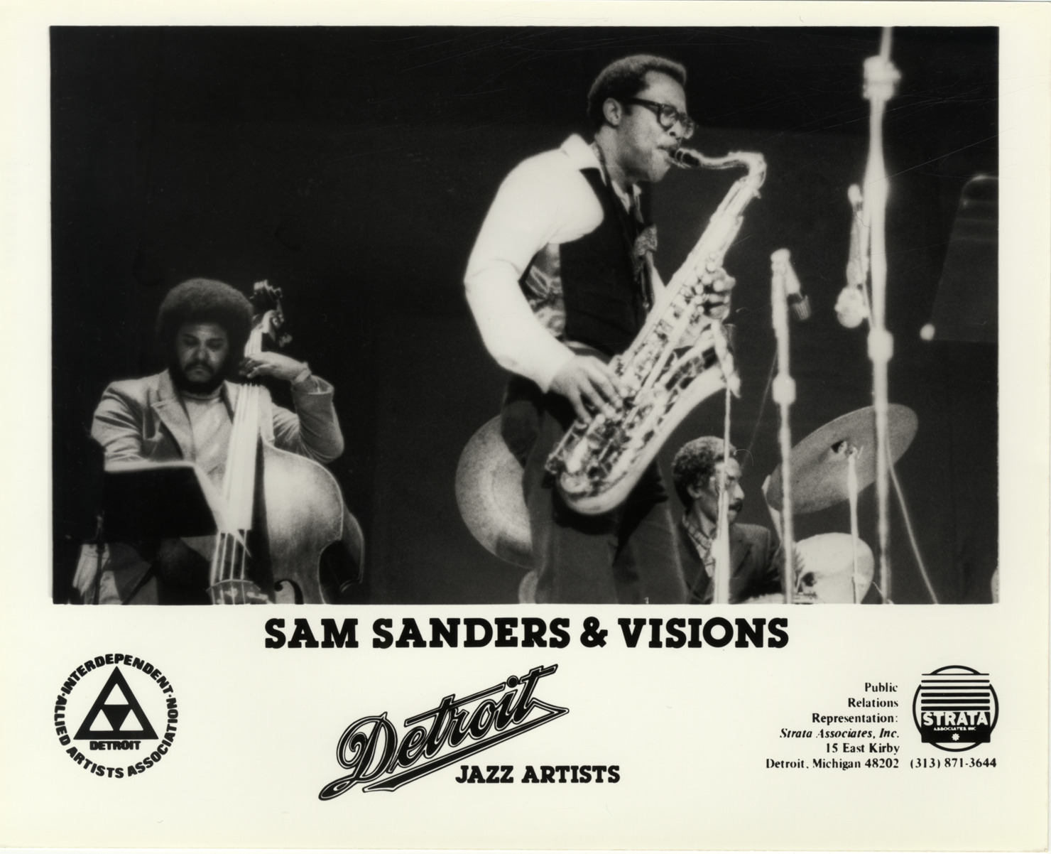 View of musician Sam Sanders playing saxophone with members of musical ensemble, Visions. Bass player and drummer in background. Printed on front: "Sam Sanders & Visions. Detroit jazz artists. Interdependent Allied Artists Association. Public relations representation: Strata Associates, Inc., 15 East Kirby, Detroit, Michigan 48202, (313) 871-3644." Handwritten on back: "Sanders."