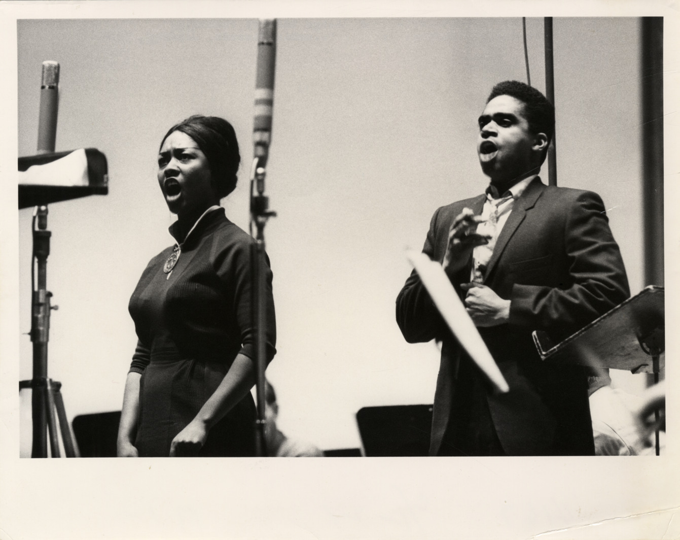 View of mezzo-soprano Shirley Verrett and tenor George Shirley recording Stravinsky's opera, "Oedipus Rex" for Columbia Records. Typed on back: "Shirley Verrett-Carter and George Shirley recording Stravinsky's 'Oedipus Rex' for Columbia Records, January, 1962."