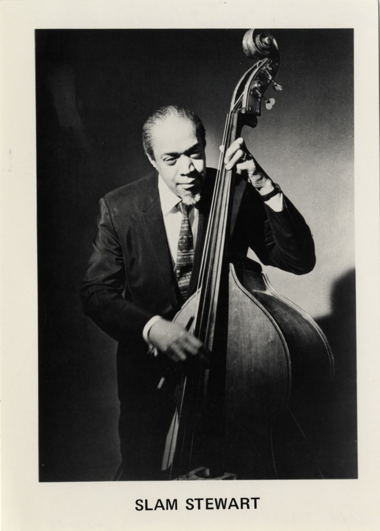 View of musician Slam Stewart, playing the bass. Printed on front: "Slam Stewart." Label on back: "Appearing with Benny Goodman in concert. Leroy 'Slam' Stewart, bassist. Slam Stewart was born in Englewood, New Jersey. He may be best known for his rendition of 'Flat foot floozie' with Slim Gaillard, and was one of the most recorded jazz artists of the mid-40's, and did a tour with Mr. Goodman in 1944. His bass playing and humming is unique in the jazz world." Handwritten on back: "Stewart, 'Slam,' (Leroy)."