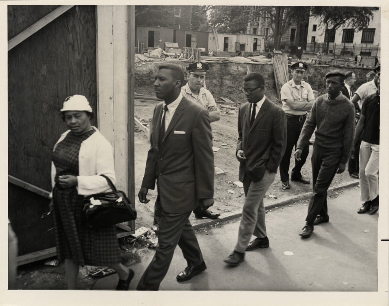 View of television reporter Bob Teague picketing with several men and women in front of group of police officers in the news report, "The American Revolution of '63." Label on back: "NBC Television Network. Exclusive to you in your city. Getting story first-hand. NBC News reporter Bob Teague (foreground) finds out how it feels to be a picket for a first-hand report in 'The American Revolution of '63,' NBC-TV's three-hour comprehensive examination of the civil rights issue, Monday, Sept. 2. He is shown getting the experience at the site of the annex to the Union County Court House in Elizabeth, N.J., where alleged discrimination in building jobs is being processed. (8/16/63)."