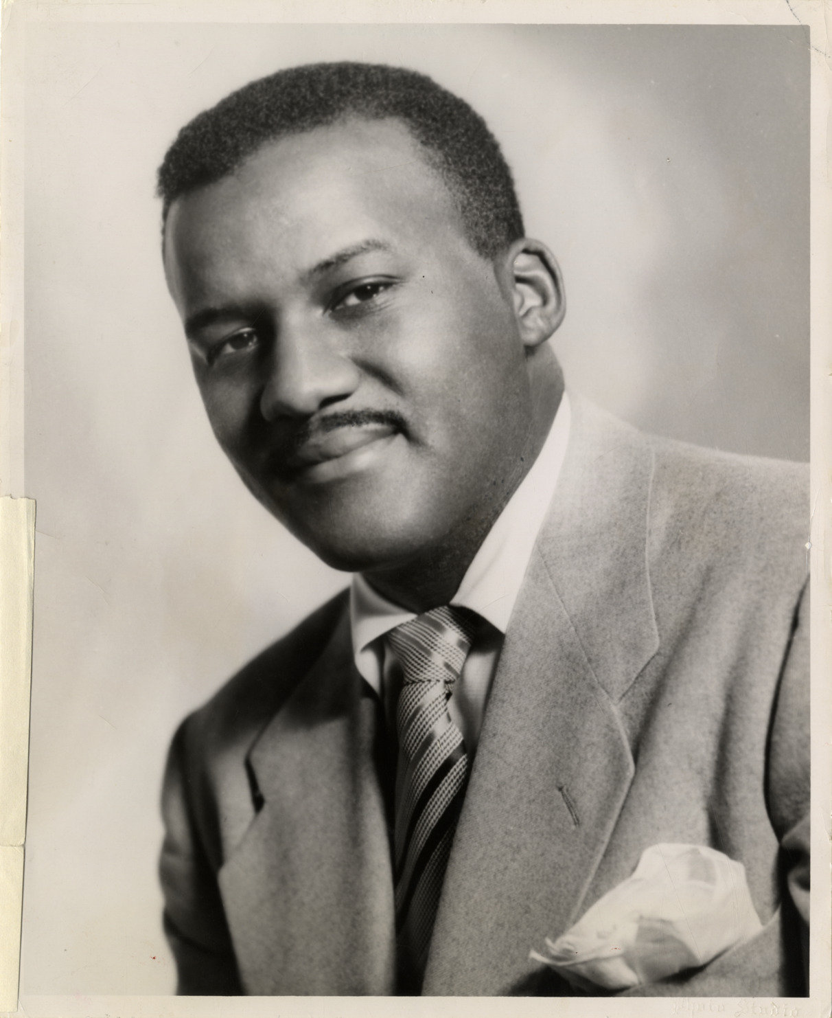 Portrait of tenor Rod Timmons. Label on back: "Tenor Rod Timmons is a featured vocalist in the new stage spectacle at New York's Radio City Music Hall. Produced by Leon Leonidoff, the show, entitled, 'Follies '64,' will be highlighted by Ravel's 'Bolero,' a ballet spectacle featuring a cast of over 100 performers." Typed on back: "Timmons, Rod."