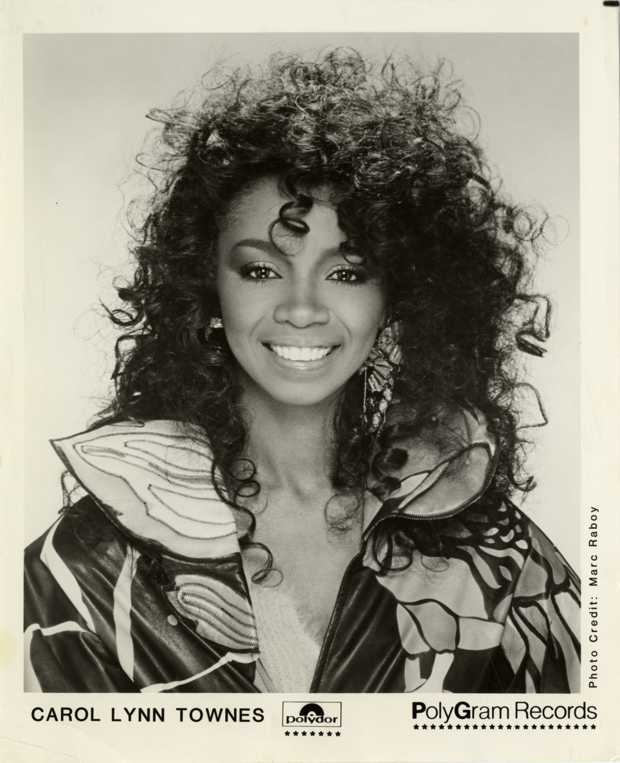 Favorite this☆ Carol Lynn Townes Description: Portrait of singer Carol Lynn Townes. Printed on front: "Carol Lynn Townes. Polydor. PolyGram Records. Photo credit: "Marc Raboy." Details Resource ID: hk001710 Creator: Raboy, Marc Subject: Townes, Carol Lynn African American women singers Photographic prints Format: 1 photographic print ; 10 x 8 in. Member of: E. Azalia Hackley Collection Filing Location: Biography--Townes, Carol Lynn Rights: Physical rights are retained by DPL. Copyright is retained in accordance with U.S. copyright laws.