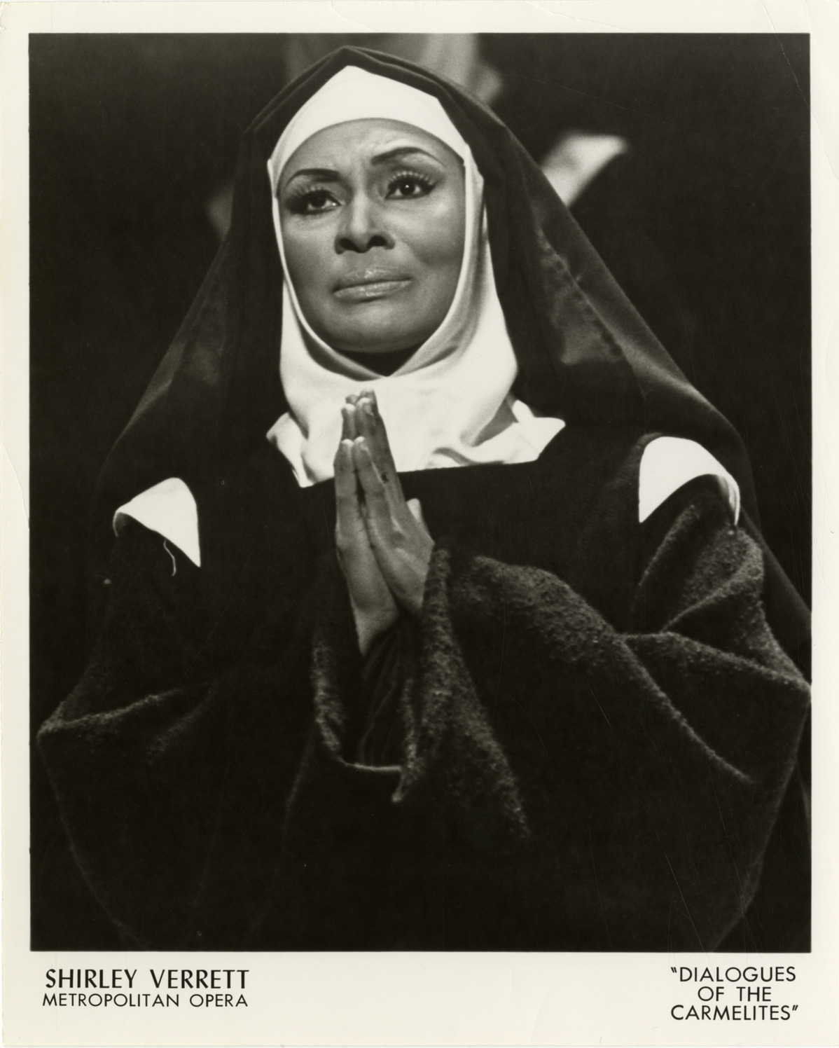 Favorite this☆ Shirley Verrett in "Dialogues of the Carmelites" Description: View of mezzo-soprano Shirley Verrett performing in Poulenc's opera, "Dialogues des Carmelites." Printed on front: "Shirley Verrett, Metropolitan Opera. 'Dialogues of the Carmelites.'" Details Resource ID: hk001757 Subject: Verrett, Shirley African American women singers Poulenc, Francis, 1899-1963. Dialogues des Carmelites Photographic prints Format: 1 photographic print ; 10 x 8 in. Member of: E. Azalia Hackley Collection Filing Location: Biography--Verrett, Shirley Rights: Physical rights are retained by DPL. Copyright is retained in accordance with U.S. copyright laws.