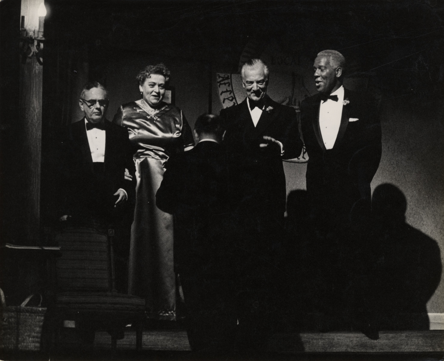 View of singer and actor Laurence Watson, actors Teddy Hart and Dennis King and an unidentified actress in a scene from the play, "Come to the dance" at the Coconut Grove Playhouse in Miami, Florida. Stamped on back: "Please credit photo Ray Fisher, 10700 S.W. 72nd Ct., Miami 56, Fla." Typed on back: "Watson, Laurence." Handwritten on back: "Freddy [sic] Hart, Dennis King, Laurence Watson. 'Come to the dance,' Coconut Grove Playhouse, Miami, Fla. 1959-60."