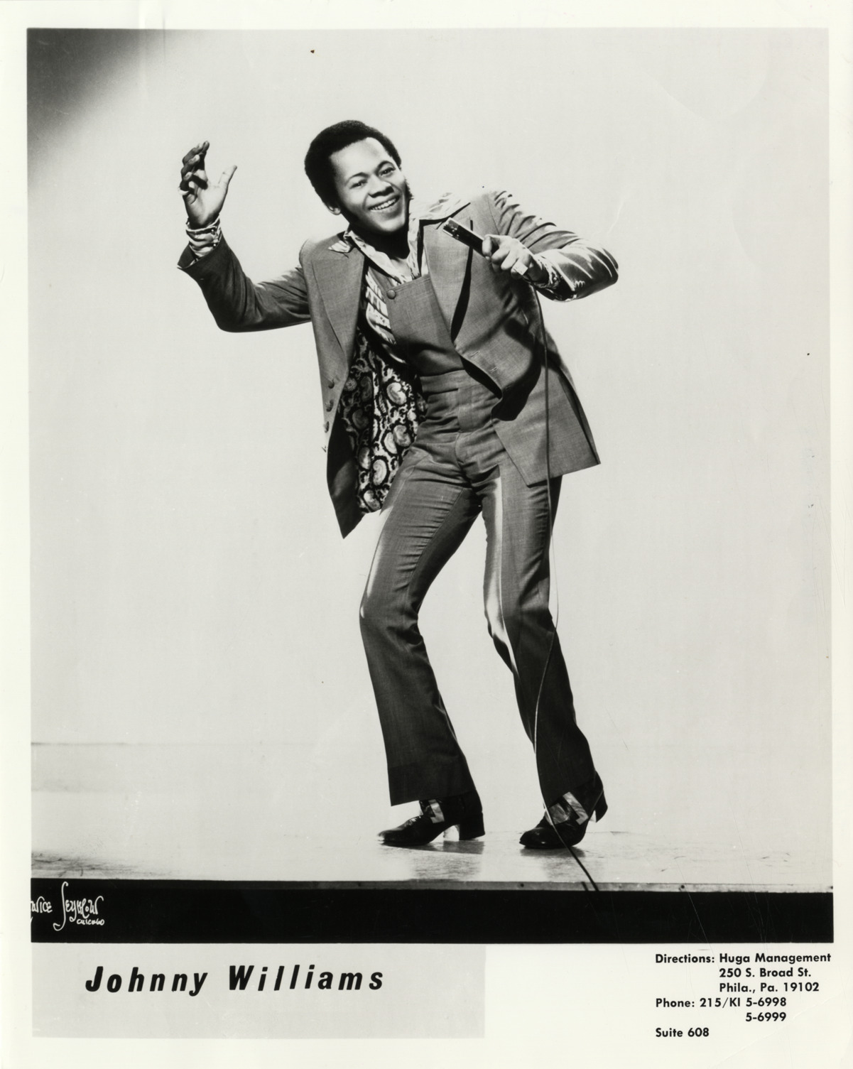 Favorite this☆ Johnny Williams Description: Portrait of singer Johnny Williams. Printed on front: "Johnny Williams. Directions: Hugo Management, 250 S. Broad St., Phila. Pa. 19102. Phone: 215/KI 5-6998, 5-6999, Suite 608. Maurice Seymour, Chicago." Handwritten on back: "Williams, Johnny." Details Resource ID: hk001872 Creator: Seymour, Maurice Subject: Williams, Johnny, 1942-1986 African American singers Photographers--Illinois--Chicago Photographic prints Date Issued: Unknown year Format: 1 photographic print ; 10 x 8 in. Member of: E. Azalia Hackley Collection Filing Location: Biography--Williams, Johnny Rights: Physical rights are retained by DPL. Copyright is retained in accordance with U.S. copyright laws.