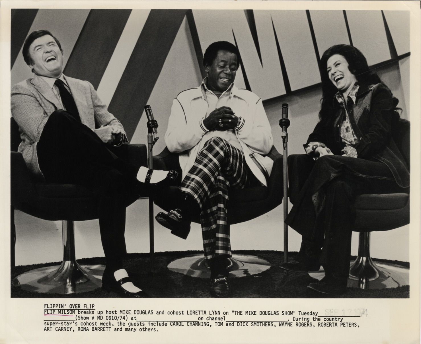 View of actor and comedian Flip Wilson with singer Loretta Lynn and host Mike Douglas on "The Mike Douglas show." Printed on front: "Flippin' over Flip. Flip Wilson breaks up host Mike Douglas and cohost Loretta Lynn on 'The Mike Douglas show' Tuesday [blank] (Show # MD 0910/74) at [blank] on channel [blank]. During the country super-star's cohost week, the guests include Carol Channing, Tom and Dick Smothers, Wayne Rogers, Roberta Peters, Art Carney, Rona Barrett and many others." Handwritten on back: "Wilson, Flip, actor/comedian."
