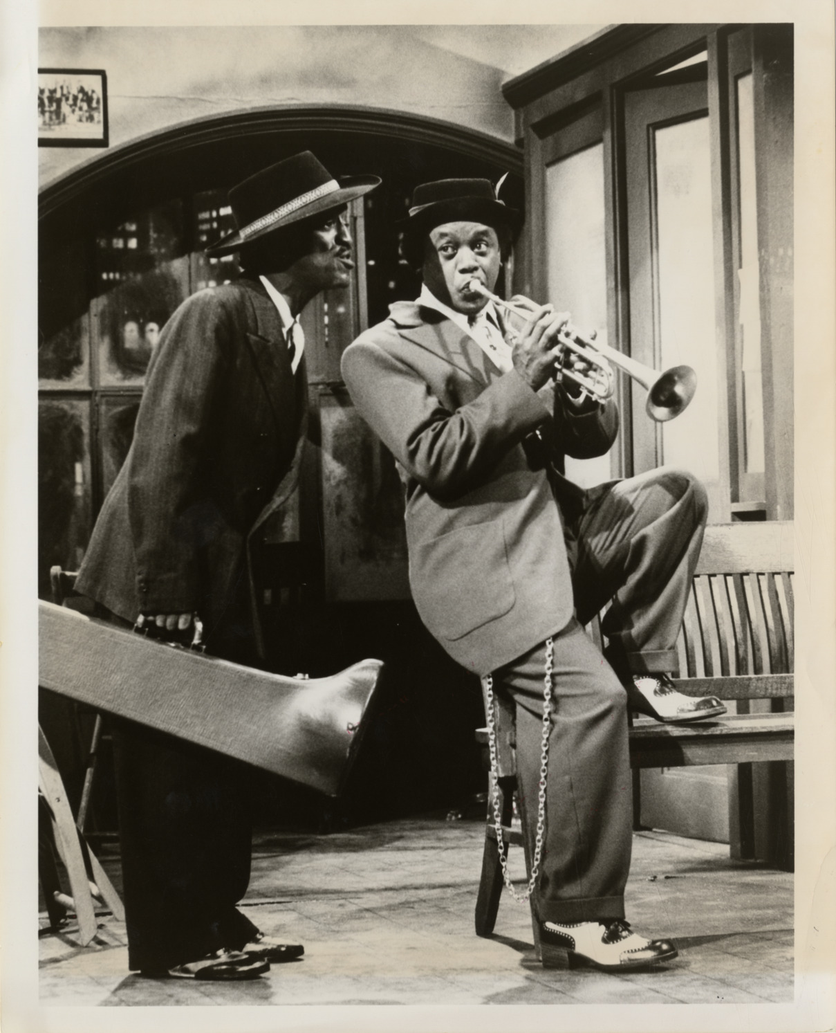 Favorite this☆ Flip Wilson and Sammy Davis, Jr. Description: View of actor and comedian Flip Wilson with singer and actor Sammy Davis, Jr. performing in an unidentified skit. Both men are costumed as musicians; Wilson holds a trumpet and Davis holds a music case. Handwritten on back: "Wilson, Flip, comedian." Details Resource ID: hk001889 Subject: Wilson, Flip African American actors African American comedians Davis, Sammy, Jr., 1925-1990 Trumpet Photographic prints Date Issued: Unknown year Format: 1 photographic print ; 10 x 8 in. Member of: E. Azalia Hackley Collection Filing Location: Biography--Wilson, Flip Rights: Physical rights are retained by DPL. Copyright is retained in accordance with U.S. copyright laws.