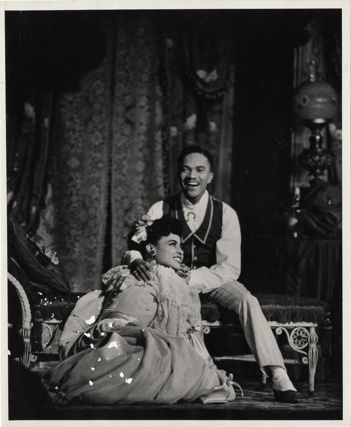 View of Ruby Hill and Harold Nicholas performing in the musical "St. Louis woman." Label on back: "Harold Nicholas and Ruby Hill pledge their love 'Come rain or come shine' in a scene from 'St. Louis woman,' new musical hit presented by Edward Gross at Martin Beck Theatre." Stamped on back: "Graphic House, 149 East 40th St., New York, N.Y. Murray Hill 6-8826."