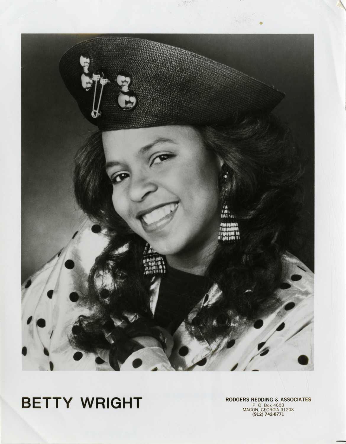 Favorite this☆ Betty Wright Description: Portrait of singer Betty Wright. Printed on front: "Betty Wright. Rodgers, Redding & Associates. P.O. Box 4603, Macon, Georgia 31208, (912) 742-8771." Details Resource ID: hk001908 Subject: Wright, Betty, 1953- African American women singers Photographic prints Date Issued: Unknown year Format: 1 photographic print ; 10 x 8 in. Member of: E. Azalia Hackley Collection Filing Location: Biography--Wright, Betty Rights: Physical rights are retained by DPL. Copyright is retained in accordance with U.S. copyright laws.