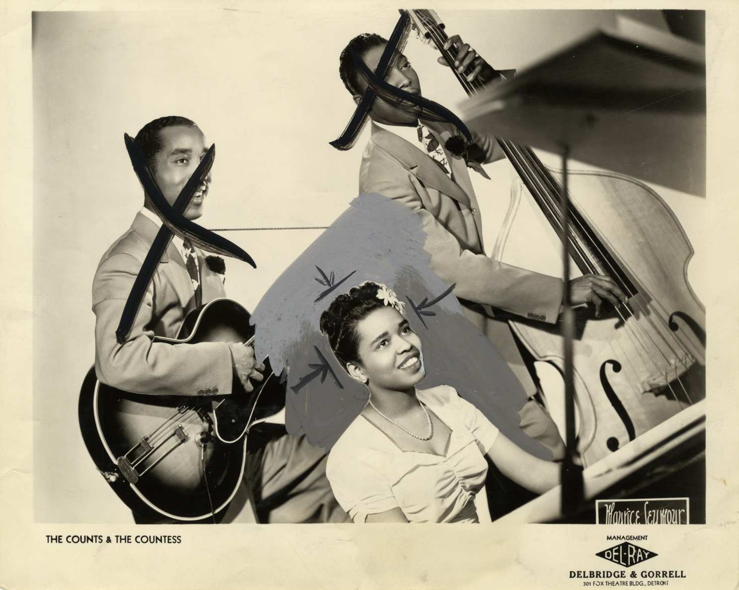 View of the musical group the Counts and the Countess, featuring Curtis Wilder on bass, Johnny Fave on the guitar and Alma Smith (Foster) at the piano. Some editing markings on front. Printed on front: "The Counts & the Countess. Management, Del-Ray, Delbridge & Gorrell, 301 Fox Theatre Bldg., Detroit. Maurice Seymour, Chicago." Handwritten on back: "The Countess, Friday stage, after dark."