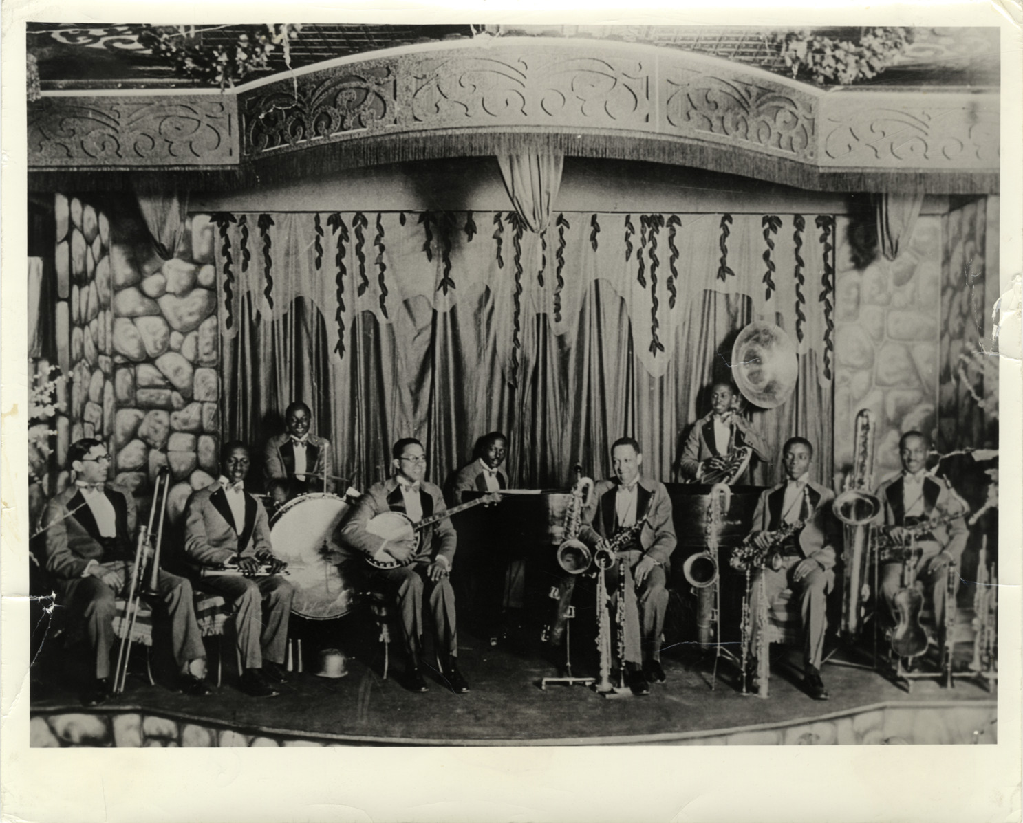 Favorite this☆ Earl Walton Orchestra Description: View of musicians from the Earl Walton Orchestra posing with musical instruments onstage. Musicians pose with trombone, trumpet, drums, piano, saxophones, violin and tuba. Handwritten on back: "Earl Walton Orchestra. Graystone." Details Resource ID: hk001923 Subject: Walton, Earl Big bands African American musicians Photographic prints Date Issued: Unknown year Format: 1 photographic print ; 8 x 10 in. Member of: E. Azalia Hackley Collection Filing Location: Groups--Earl Walton Orchestra Rights: Physical rights are retained by DPL. Copyright is retained in accordance with U.S. copyright laws.