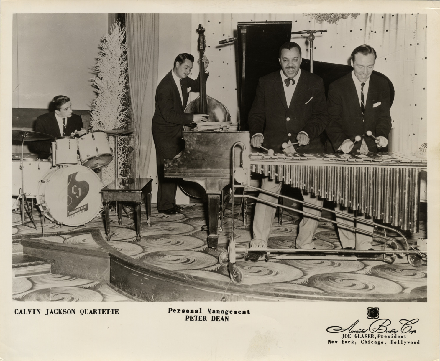 View of the Calvin Jackson Quartet, performing on small stage. Musicians play drums, bass, and vibraphone; piano in background. Printed on front: "Calvin Jackson Quartette [sic]. Personal management, Peter Dean. Associated Booking Corp., Joe Glaser, President, New York, Chicago, Hollywood." Handwritten on back: "Calvin Jackson Quartette [sic], jazz band."
