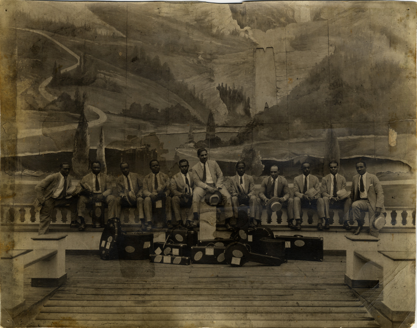 View of Ray Jackson and his orchestra posing on stage in front of painted scenery. Musical instrument cases in foreground. Stamped on back: "Capital Attractions, Inc. Our new address, 1822 North Third St., Harrisburg, Pa." Handwritten on back: "Ray Jackson & Orchestra."