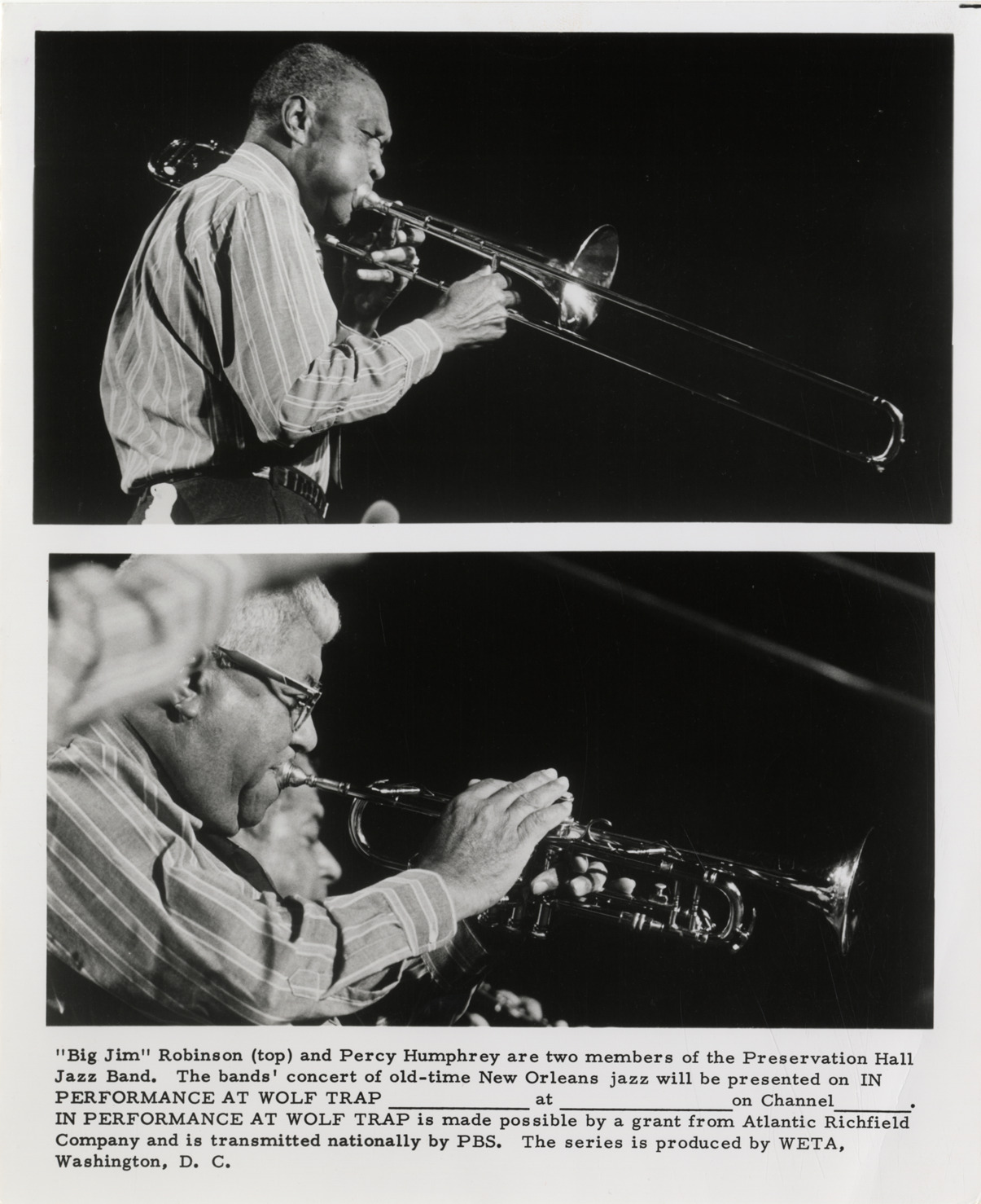 Two views of trombonist "Big Jim" Robinson and trumpet player Percy Humphrey performing with the Preservation Hall Jazz Band. Printed on front: "'Big Jim' Robinson (left) and Percy Humphrey are two members of the Preservation Hall Jazz Band. The band's concert of old-time New Orleans jazz will be presented on 'In performance at Wolf Trap' [blank] at [blank] on Channel [blank]. 'In performance at Wolf Trap' is made possible by a grant from the Atlantic Richfield Company and is transmitted nationally by PBS. The series is produced by WETA, Washington, D.C." Handwritten on back: "Preservation Hall Jazz Band."