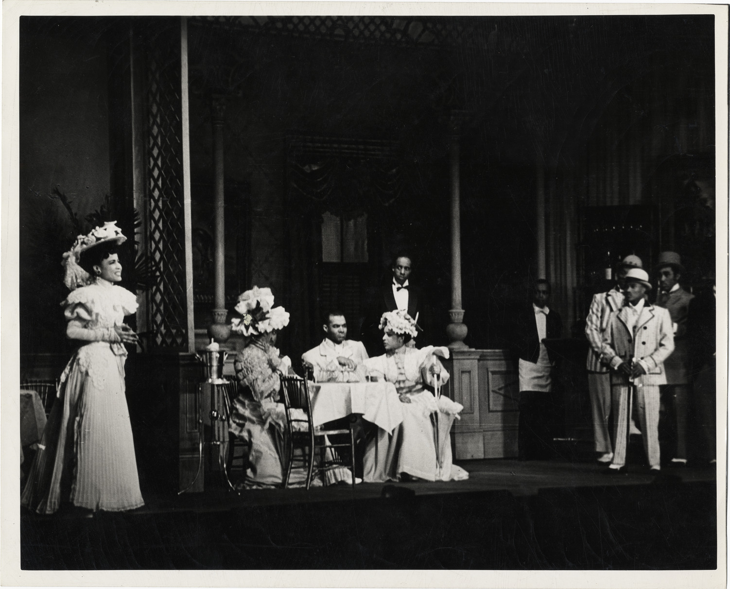View of cast performing a scene from the musical "St. Louis woman." Stamped on back: "Please credit Richard Tucker." Handwritten on back: "After a long separation Ruby Hill as Della Green is reunited with her beloved jockey, played by Harold Nicholas in a scene from 'St. Louis woman,' showing the fashionable inn to which she has gone with rich Ragsland, wealthy Negro of old St. Louis."