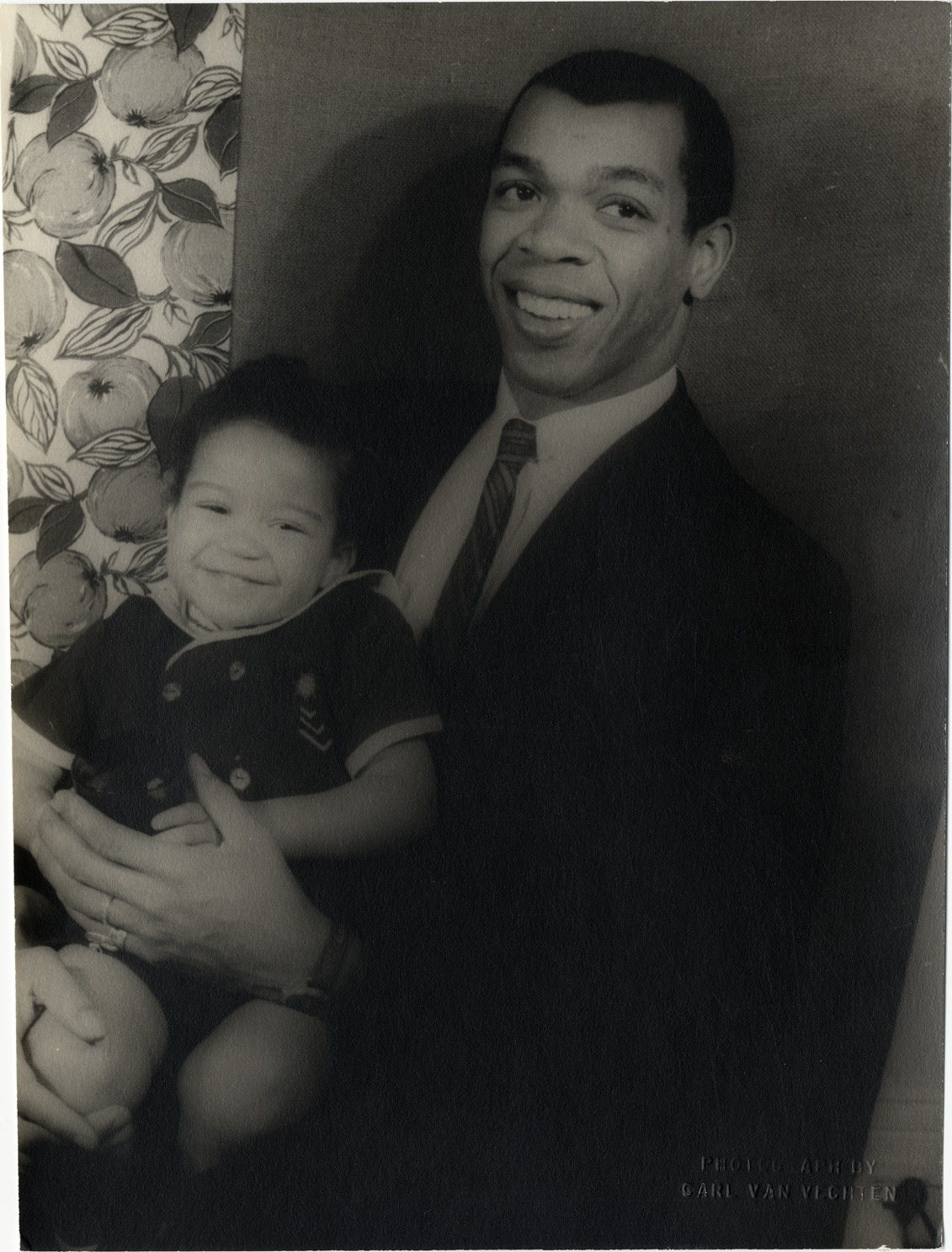 Portrait of dancer, actor and artist Geoffrey Holder and his son, Leo Holder. Embossed on front: "Photograph by Carl Van Vechten." Stamped on back: "Photograph by Carl Van Vechten. 146 Central Park West. Cannot be reproduced without permission." Handwritten on back: "Geoffrey Holder & his son Leo. X QQ 12. December 26, 1958."