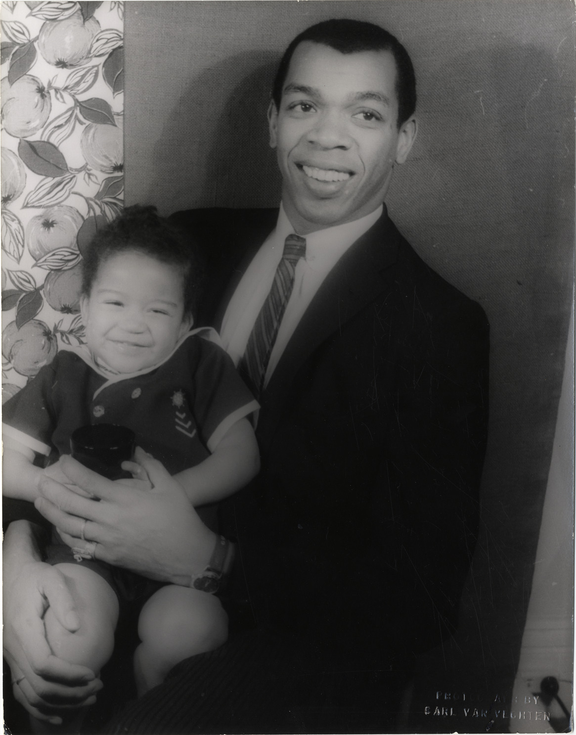 Portrait of dancer, actor and artist Geoffrey Holder and his son, Leo Holder. Embossed on front: "Photograph by Carl Van Vechten." Stamped on back: "Photograph by Carl Van Vechten. 146 Central Park West. Cannot be reproduced without permission." Handwritten on back: "Geoffrey Holder & his son Leo. X QQ 11. Dec. 26, 1958."