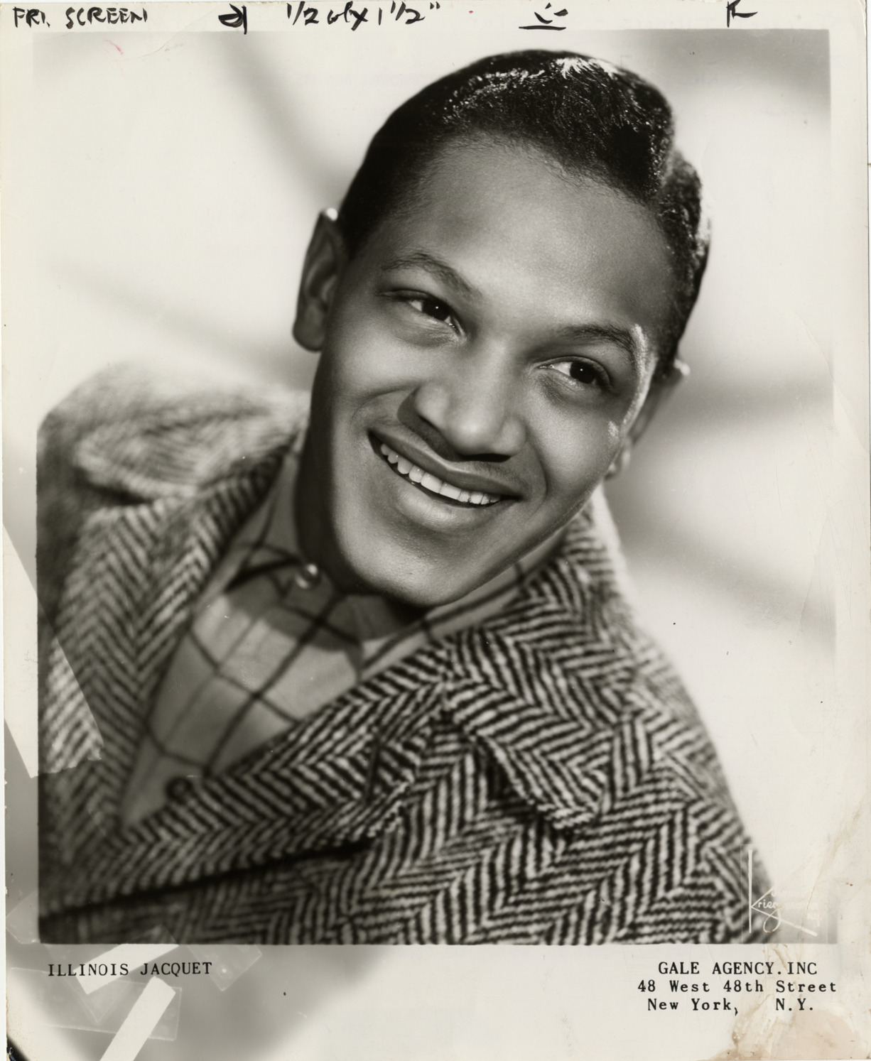 Portrait of musician and bandleader Illinois Jacquet. Printed on front: "Illinois Jacquet. Gale Agency, Inc. 48 West 48th Street. New York, N.Y. James J. Kriegsmann, N.Y." Stamped on back: "Illinois Jacquet, the dynamic saxophonist and his orchestra co-headlines 'The biggest show of 1953' at [blank] on [blank] with Nat 'King' Cole, Sarah Vaughn, Ralph Marterie and his orchestra, George Kirby, Peg Leg Bates and Helen & Howard." Typed on back: "Illinois Jacquet and his orchestra. Opening Friday, April 16, at Crystal Show Bar." Handwritten on back: "Jacquet, Illinois, sax star and his orchestra."
