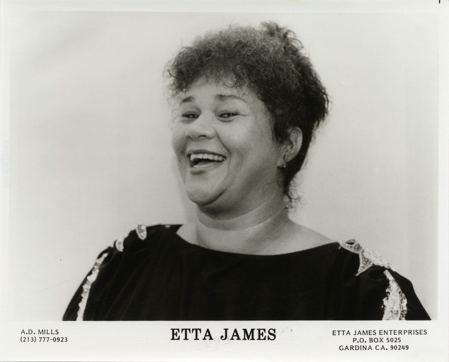 Portrait of singer Etta James. Printed on front: "Etta James. A.D. Mills, (213) 777-0923. Etta James Enterprises, P.O. Box 5025, Gardina, Ca. 90249."