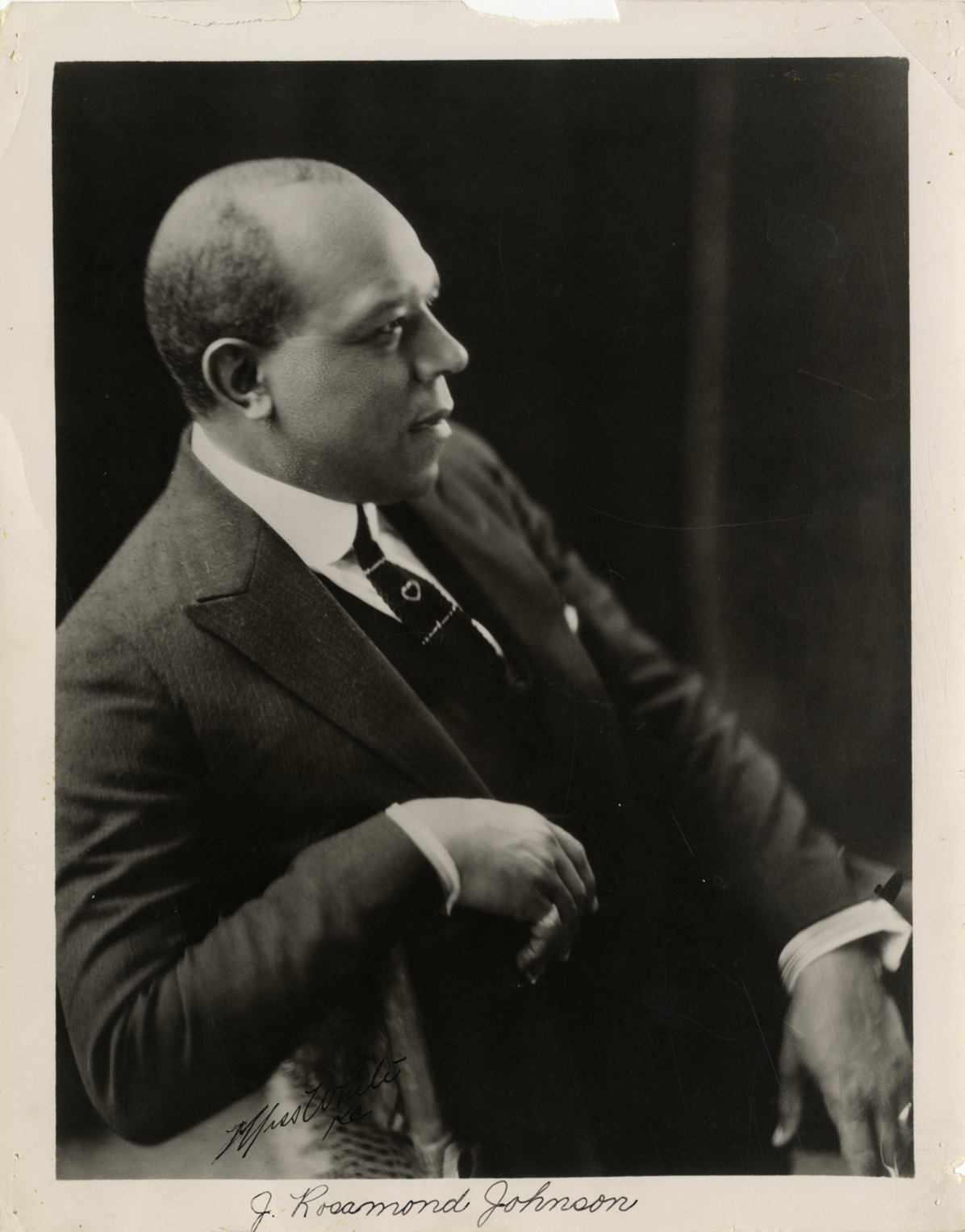 Portrait of composer and actor J. Rosamond Johnson. Handwritten on front: "Miss White, KC. J. Rosamond Johnson." Stamped on back: "Goldie & Gumm, 1540 Broadway, New York City." Handwritten on back: "J. Rosamond Johnson, appearing in George Gershwin's 'Porgy & Bess' coming to the Erlanger Theatre, for 3 days, beginning Thurs. Oct. 1st."