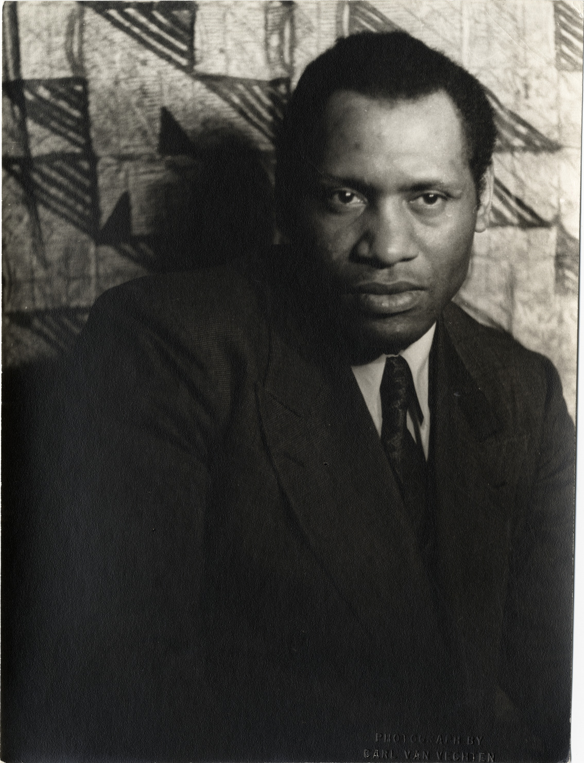 Portrait of actor and singer Paul Robeson. Embossed on front: "Photograph by Carl Van Vechten." Stamped on back: "Photograph by Carl Van Vechten. 146 Central Park West. Cannot be reproduced without permission." Handwritten on back: "Paul Robeson. XLII I 7. 10 Jan. 1936."
