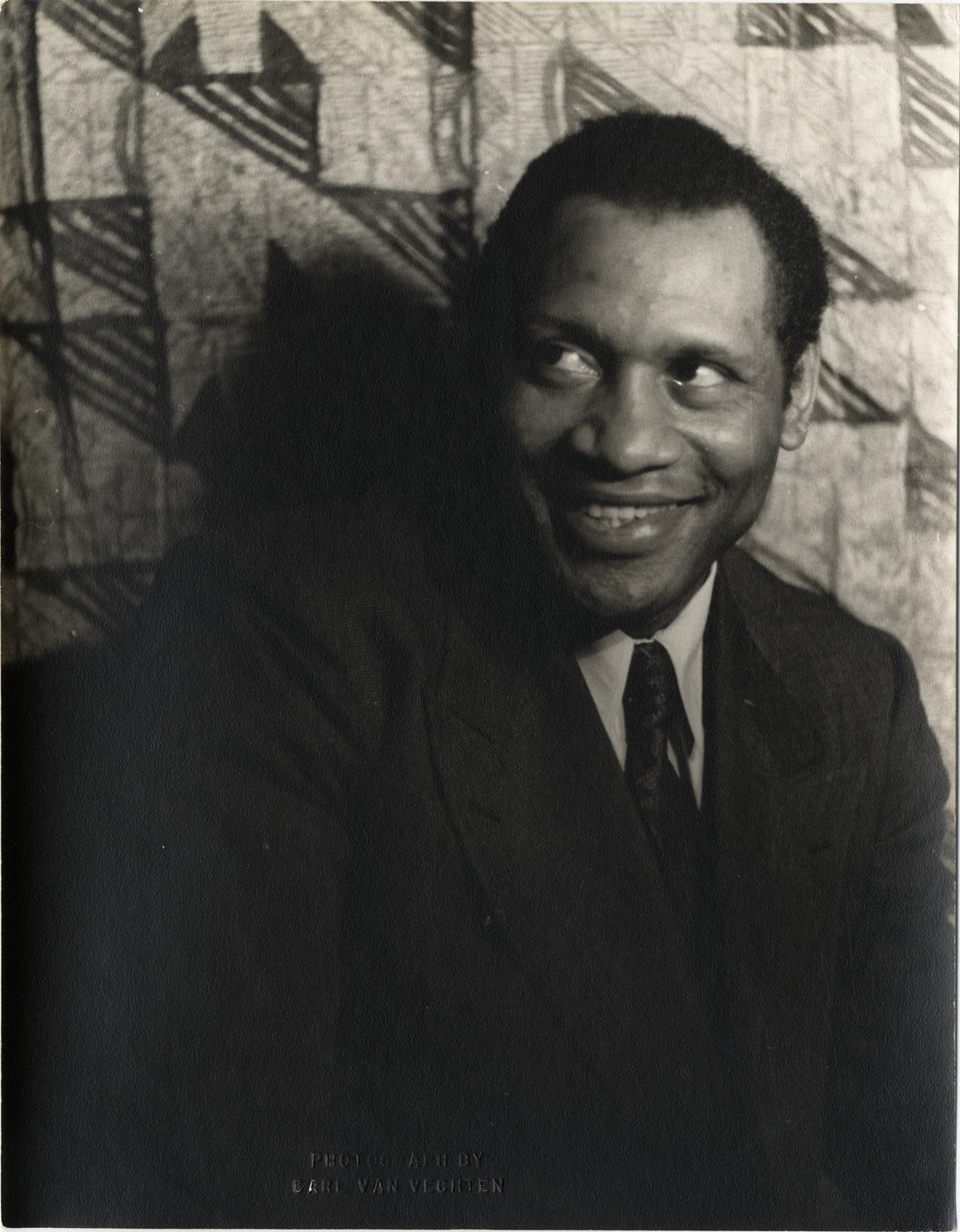 Portrait of actor and singer Paul Robeson. Embossed on front: "Photograph by Carl Van Vechten." Stamped on back: "Photograph by Carl Van Vechten. 146 Central Park West. Cannot be reproduced without permission." Handwritten on back: "Paul Robeson. XLII I. 10 Jan. 1936."