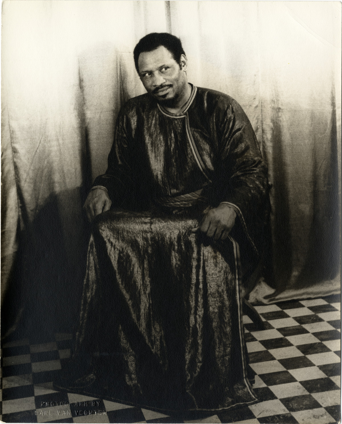 Portrait of actor and singer Paul Robeson as Othello. Embossed on front: "Photograph by Carl Van Vechten." Stamped on back: "Photograph by Carl Van Vechten. 146 Central Park West. Cannot be reproduced without permission." Handwritten on back: "Paul Robeson as Othello. VI AA 16. June 1 '44."