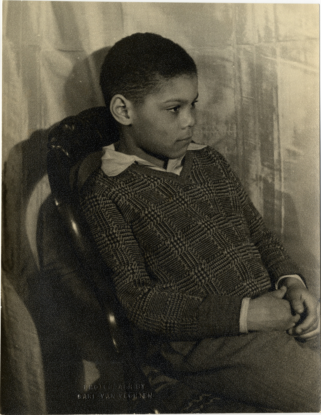 Portrait of Paul Robeson, Jr., the son of actor and singer Paul Robeson. Embossed on front: "Photograph by Carl Van Vechten." Stamped on back: "Photograph by Carl Van Vechten. Cannot be reproduced without permission." Handwritten on back: "Paul Robeson, Jr. XXXVII G 21. Feb. 15, 1935."