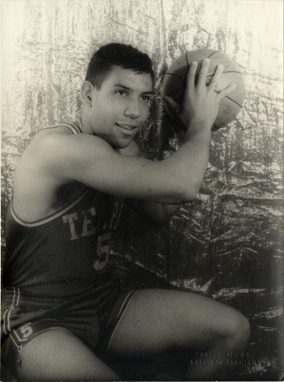 Portrait of basketball player Guy Rodgers, holding a basketball. Embossed on front: "Photograph by Carl Van Vechten." Stamped on back: "Photograph by Carl Van Vechten. 146 Central Park West. Cannot be reproduced without permission." Handwritten on back: "Guy Rodgers. XXXVIII M 6. May 24, 1958."