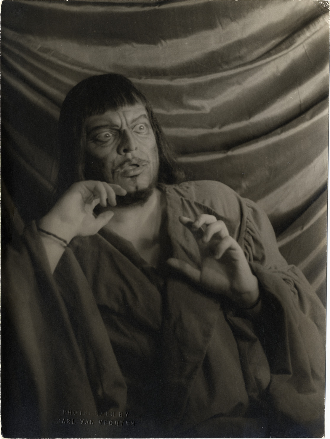 View of actor Orson Welles portraying Dr. Faustus from the play by Christopher Marlowe. Embossed on front: "Photograph by Carl Van Vechten." Stamped on back: "Photograph by Carl Van Vechten. Cannot be reproduced without permission." Handwritten on back: "Orson Welles, 'Dr. Faustus' (Marlowe). XVII K 15. 1 March 1937."