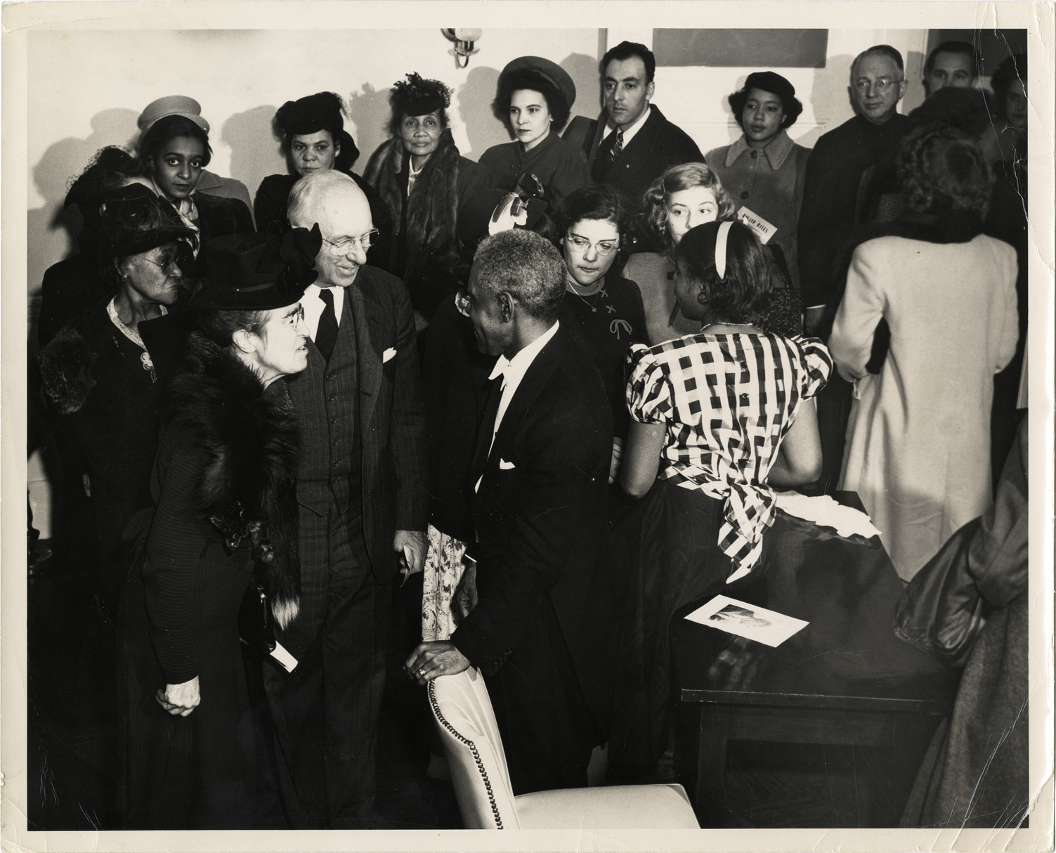 View of tenor Roland Hayes greeting audience members backstage after his recital at Symphony Hall, Boston. Stamped on back: "Please credit David Nilsson, photographer." Handwritten on back: "Roland Hayes, Governor Coolidge and part of audience in green room of Symphony Hall after Hayes 30th Anniversary recital in Symphony Hall in 1947."