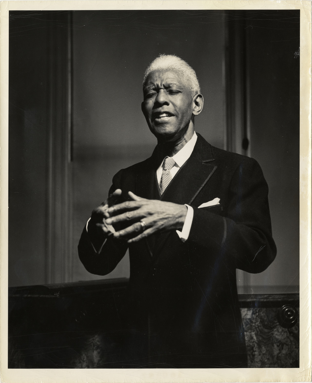 Favorite this☆ Roland Hayes performing in concert Description: View of tenor Roland Hayes performing in concert. Stamped on back: "Photograph by John Brook, 121A Newbury, Boston 16 USA, please credit." Details Resource ID: hk002346 Creator: Brook, John Subject: Hayes, Roland, 1887-1977 Hayes, Roland, 1887-1977--Performances African American singers Photographers--Massachusetts--Boston Photographic prints Date Issued: Unknown year Format: 1 photographic print ; 10 x 8 in. Member of: E. Azalia Hackley Collection Filing Location: MS/Hayes, Roland W.--Hayes, Roland--Concert performances #2, Series 6: Photographs, Box 1, File 19 Rights: Physical rights are retained by DPL. Copyright is retained in accordance with U.S. copyright laws.