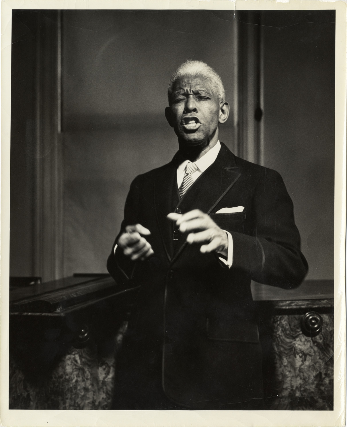 Favorite this☆ Roland Hayes performing in concert Description: View of tenor Roland Hayes performing in concert. Stamped on back: "Photograph by John Brook, 121A Newbury, Boston 16 USA, please credit." Details Resource ID: hk002347 Creator: Brook, John Subject: Hayes, Roland, 1887-1977 Hayes, Roland, 1887-1977--Performances African American singers Photographers--Massachusetts--Boston Photographic prints Date Issued: Unknown year Format: 1 photographic print ; 10 x 8 in. Member of: E. Azalia Hackley Collection Filing Location: MS/Hayes, Roland W.--Hayes, Roland--Concert performances #2, Series 6: Photographs, Box 1, File 19 Rights: Physical rights are retained by DPL. Copyright is retained in accordance with U.S. copyright laws.