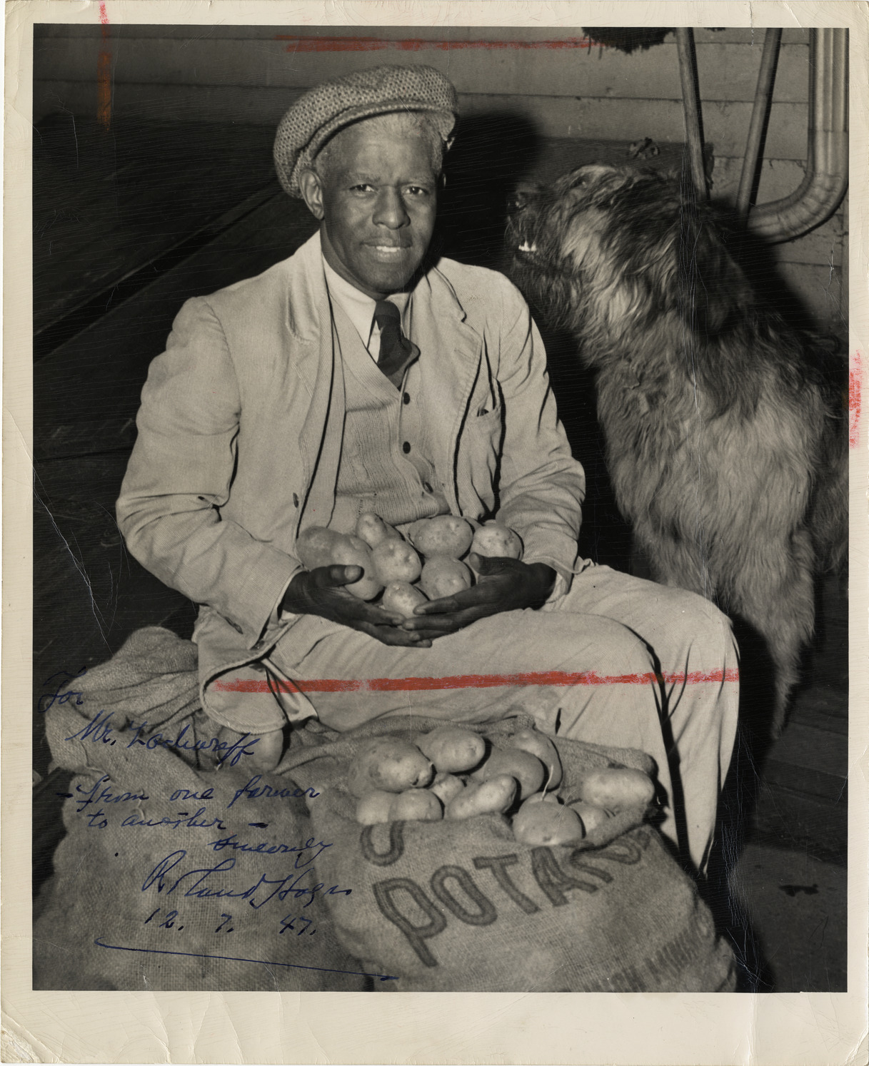 View of tenor Roland Hayes, posing with a dog and two sacks of potatoes at his farm in West Newbury, Massachusetts. Autographed on front: "For Mr. Zachareff, from one farmer to another. Sincerely, Roland Hayes, 12.7.47." Stamped on back: "Herald Tribune photo, Ted Kell." Typed on back: "Roland Hayes displaying the results of very fruitful effort at this farm in West Newbury, Mass." Handwritten on back: "Roland Hayes, Kell photo, 1947."